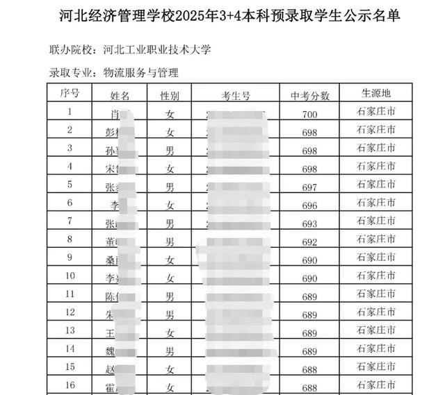 那么问题来了,是不是所有的“3+4”贯通本科的分数线都这么高呢?当然不是。目前来看,也只有石家庄装备制造学校的一家,其他学校的分数虽然也不低,但并没有这么夸张和令人惊叹!比如,河北经济管理学校的“3+4”贯通本科的物流与服务管理专业,石家庄录取的最高分是700分,最低分则是676分(上表图只是截图了部分录取学生的公示名单)。
