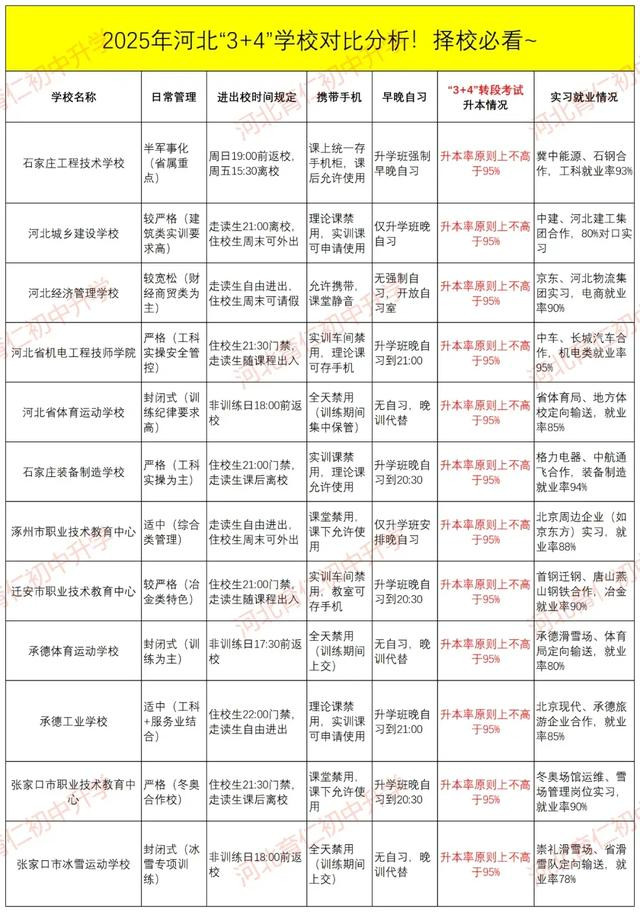 当然,这一切的前提还是需要通过转段考试,才能最终升入对口的大学。前几年,石家庄装备学校的转段成功率非常高,去年的招生简章说转段考试通过率在98%以上,但今年的招生简章把这段话给去掉了,这背后的意思大家可以再品一品。目前,石家庄“3+4”贯通本科的中职学校有12家,其中石家庄占一半,网上有同行把各个学校的日常管理、升本考试和就业实习等情况都总结出来了,供大家参考。