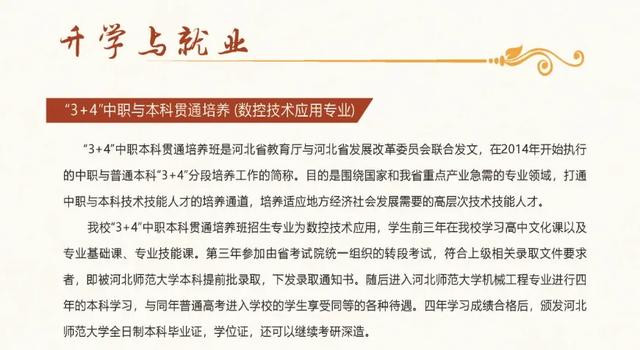 之所以出现这种情况,主要是石家庄装备制造学校的“3+4”贯通本科班有2大优势。第一,升本科的院校层次更高。3年后,通过省考试院组织的转段考试,由河北师大提前批录。第二,专业更好。进入师大后,转入机械工程专业进行本科学习,并享受普高生待遇,4年后成绩合格,颁发师大的毕业证、学位证等。毕竟,现在的工科专业吃香,学生毕业后的就业前景也更好。